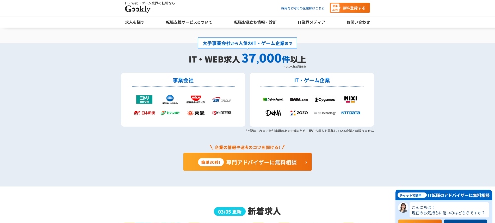 - ギークリーは採用率の高さを強みに、IT系・Web系・ゲーム業界に特化している転職エージェントです。
